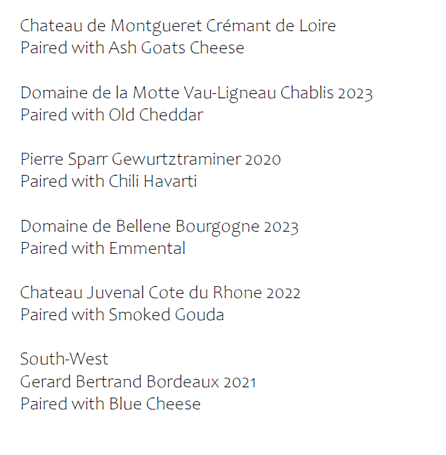 Six wines are paired to six artisan cheeses with the full private sommelier experience. These wines are approachable and represent signature styles from across the world. You will feel like an emerging wine expert after this tasting.