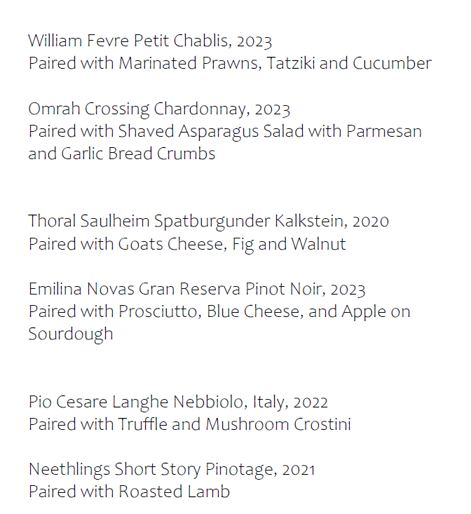 6 wines, 6 food pairings, and light bites for the table.